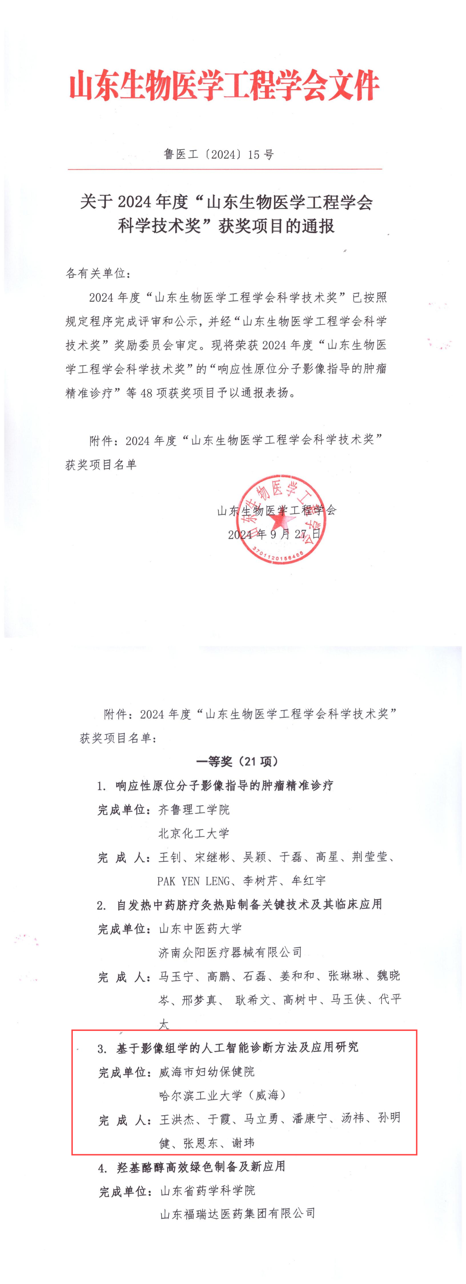 近日,威海市妇幼保健院牵头申报的《基于影像组学的人工智能诊断方法及应用研究》在山东生物医学工程学会科学技术奖评选中,荣获科学技术一等奖。山东省生物医学工程学会科学技术奖是省内首批通过山东省科技厅审核备案的社会科技奖,这一荣誉是对医院科研团队长期致力于医学创新和科技攻关的充分肯定,标志着医院在人工智能+精准医学领域的研究取得了新突破。
