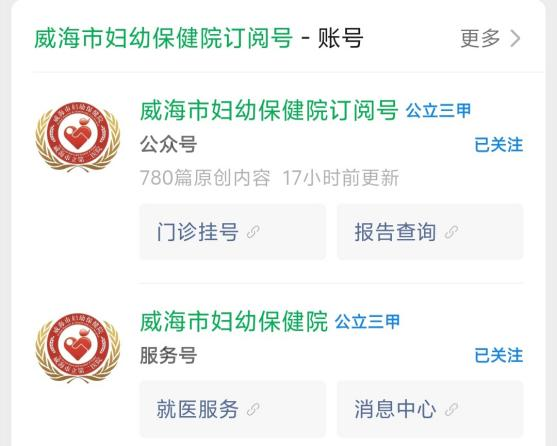 关注“威海市妇幼保健院”服务号或“威海妇幼保健院订阅号”公众号